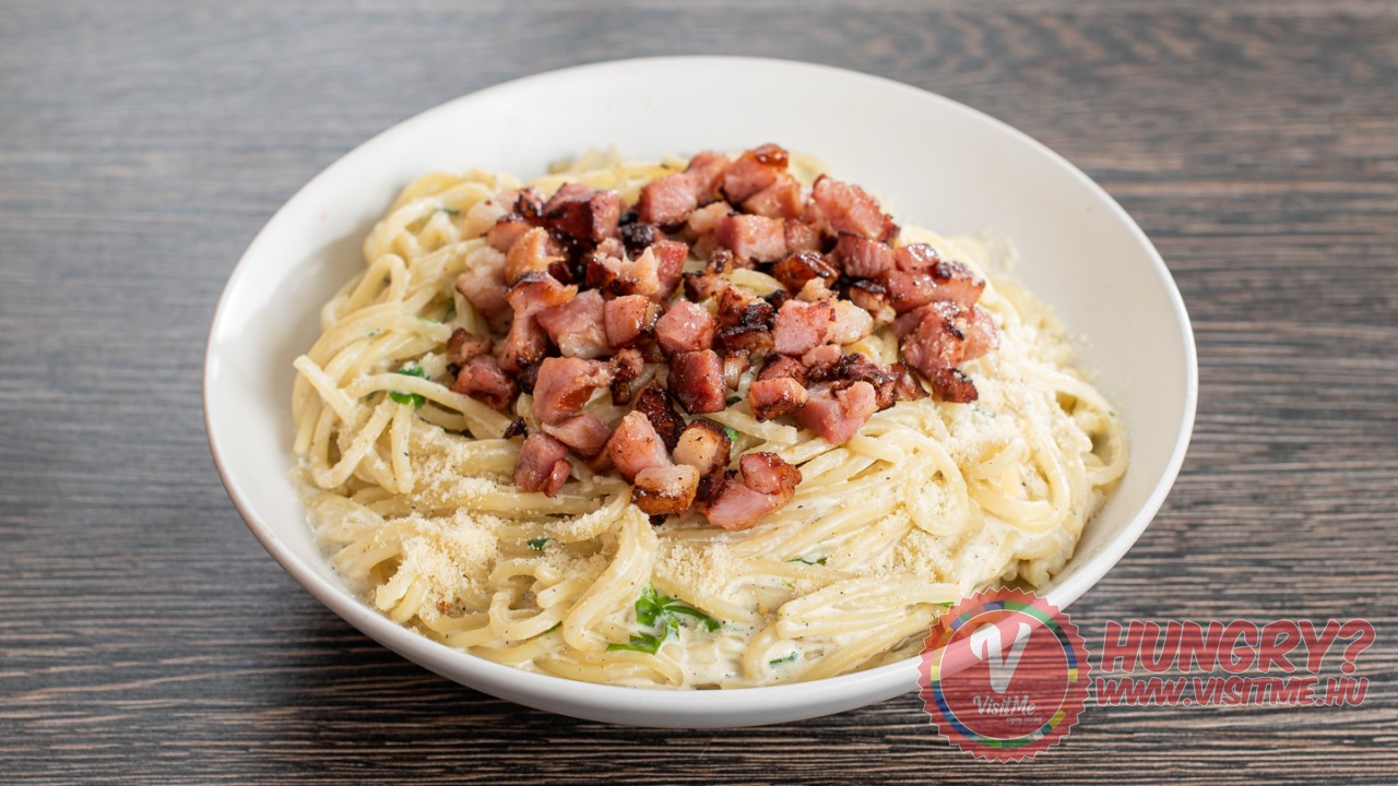 (spagetti tészta, tejszín, pirított bacon, trappista sajt)