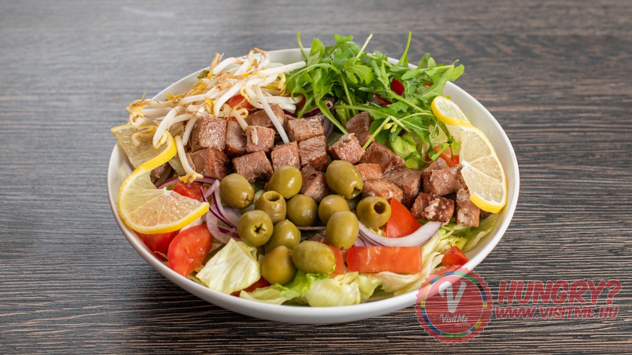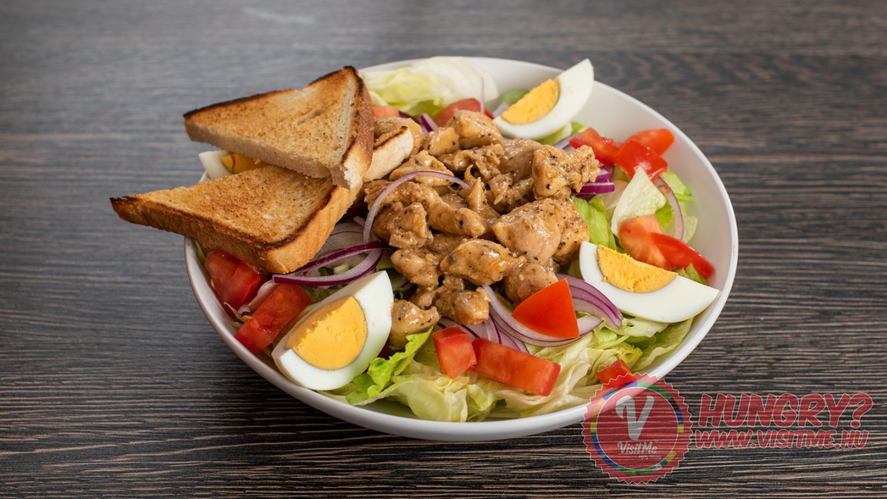 jégsaláta, paradicsom, ruccola,Piritott hagyma, Grilezet Mozarela, cézár öntett