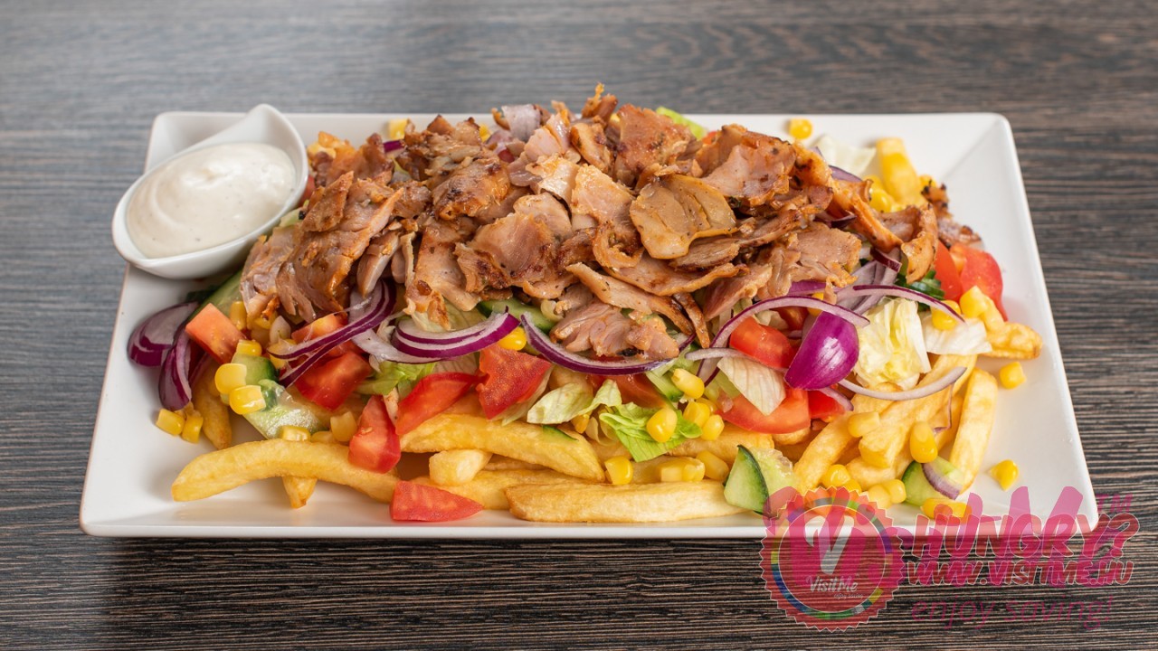 hasáburgonya, jégsaláta, uborka, paradicsom, lila hagyma, sajt, gyros hús, tartár öntet, csipős öntet